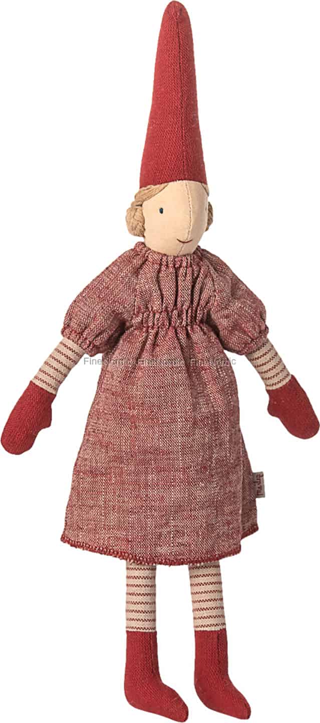 Varje Maileg-nisse anländer med en berättelse som väntar på att få utvecklas, och denna lilla vän är inget undantag. Med sitt prydligt flätade hår och sitt milda, broderade leende är hon en tyst väktare av julens hemligheter och önskningar. Föreställ dig hur hon vakar över julgranens tindrande ljus eller delar en stilla stund av frid vid den öppna spisen. Hennes traditionella röda klänning, tillverkad av ett underbart texturerat melerat tyg, och de mysiga stickade vantarna framkallar den hjärtevärmande andan av en klassisk skandinavisk jul.