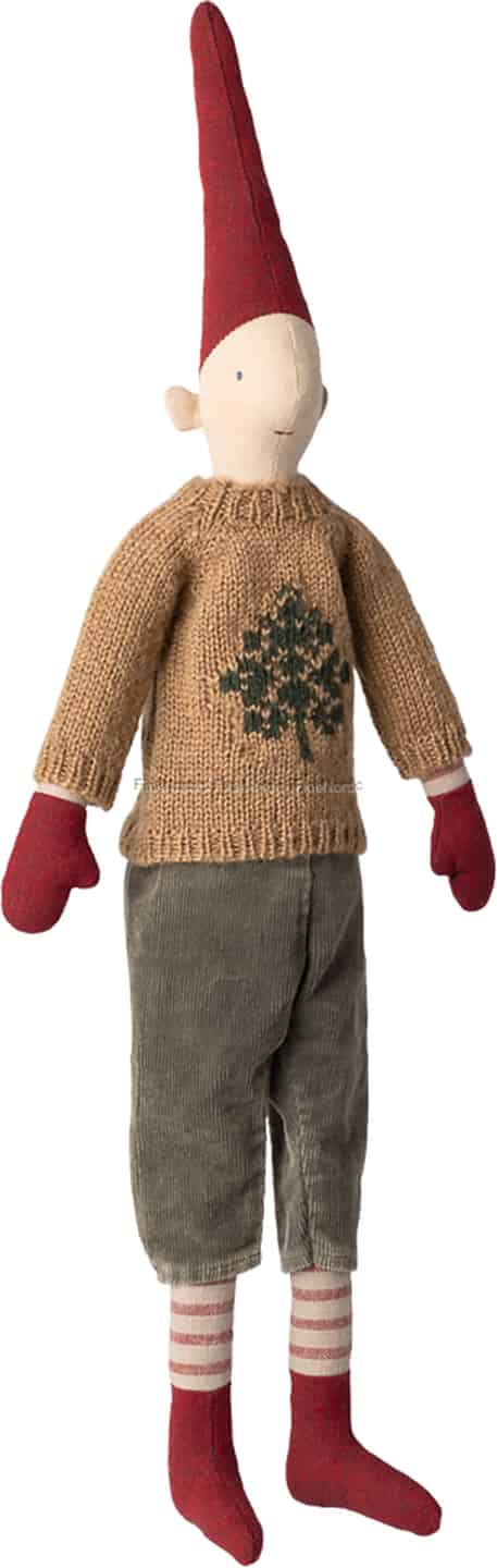 Möt er nya julväktare, en Maileg-nisse vars personlighet är insydd i varje detalj. Från toppen av sin höga, rubinröda luva till spetsarna på sina matchande stövlar förkroppsligar han hjärtat av en nordisk vinter. Hans vackert stickade tröja, prydd med en ensam gran, berättar om skogspromenader på krispiga morgnar. Hans mjuka manchesterbyxor och varma vantar antyder att han just har kommit in från kylan, redo att hitta en mysig vrå i ert hem.