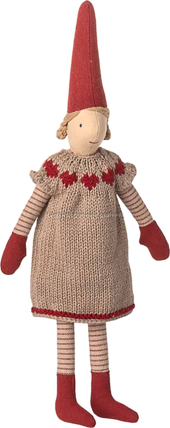 Varje detalj är noga genomtänkt, från hennes underbart mjuka stickade klänning med sitt klassiska röda mönster till hennes randiga strumpor och mysiga röda vantar. Kvaliteten på textilierna inbjuder till en varsam beröring, vilket gör henne till en verkligt speciell ägodel. Oavsett om hon blir en ny vän för ett barns stillsamma lek eller en uppskattad del av dina årliga dekorationer, är denna pixy ämnad att bli en central karaktär i din familjs julberättelse i många år framöver.