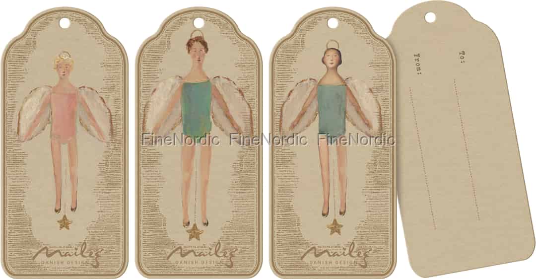 I Mailegs magiska värld berättar även de minsta detaljerna en historia. Dessa vackra presentetiketter är inget undantag och förvandlar den enkla handlingen att ge en gåva till ett ögonblick av förundran. Var och en av de tre olika ängelillustrationerna är återgiven med en mjuk, sagolik kvalitet, från deras delikata vingar med guldkant till den lilla stjärnan vid deras fötter. De dova, dämpade färgerna och den vintageinspirerade skriptbakgrunden väcker en känsla av tidlös nostalgi och viskar om kära minnen och innerliga önskningar.