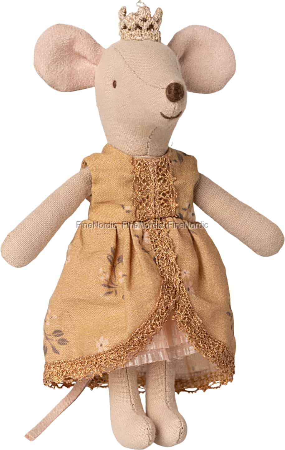 I Mailegs magiska värld har varje karaktär en historia, och Prinsessmusen är redo för sitt kapitel i din. Med sitt vänliga, broderade leende och sin mjuka, taktila känsla är hon den perfekta vännen att dela hemligheter och drömmar med. Hennes praktfulla gyllengula klänning, dekorerad med ett skirt blommönster och fin guldspets, visar att hon är redo för alla kungliga plikter – från att delta i en storslagen bal på Maileg-slottet till att vara värdinna för ett tekalas med sina vänner.