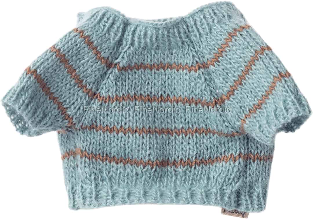 Varje kär vän förtjänar en garderob fylld med kärlek och omsorg. Denna utsökta lilla tröja från Maileg är mer än bara ett tillbehör; den är en inbjudan till en värld av stillsam och varsam lek. Föreställ dig hur ditt barn omsorgsfullt klär på sin valp för en dag fylld av fantasi, med den mjuka, grovstickade tröjan som en trygg textur i händerna. De rofyllda, dammblå och jordnära bruna ränderna väcker minnen av krispiga höstpromenader och mysiga eftermiddagar inomhus, och skapar en vacker bakgrund för nya berättelser.