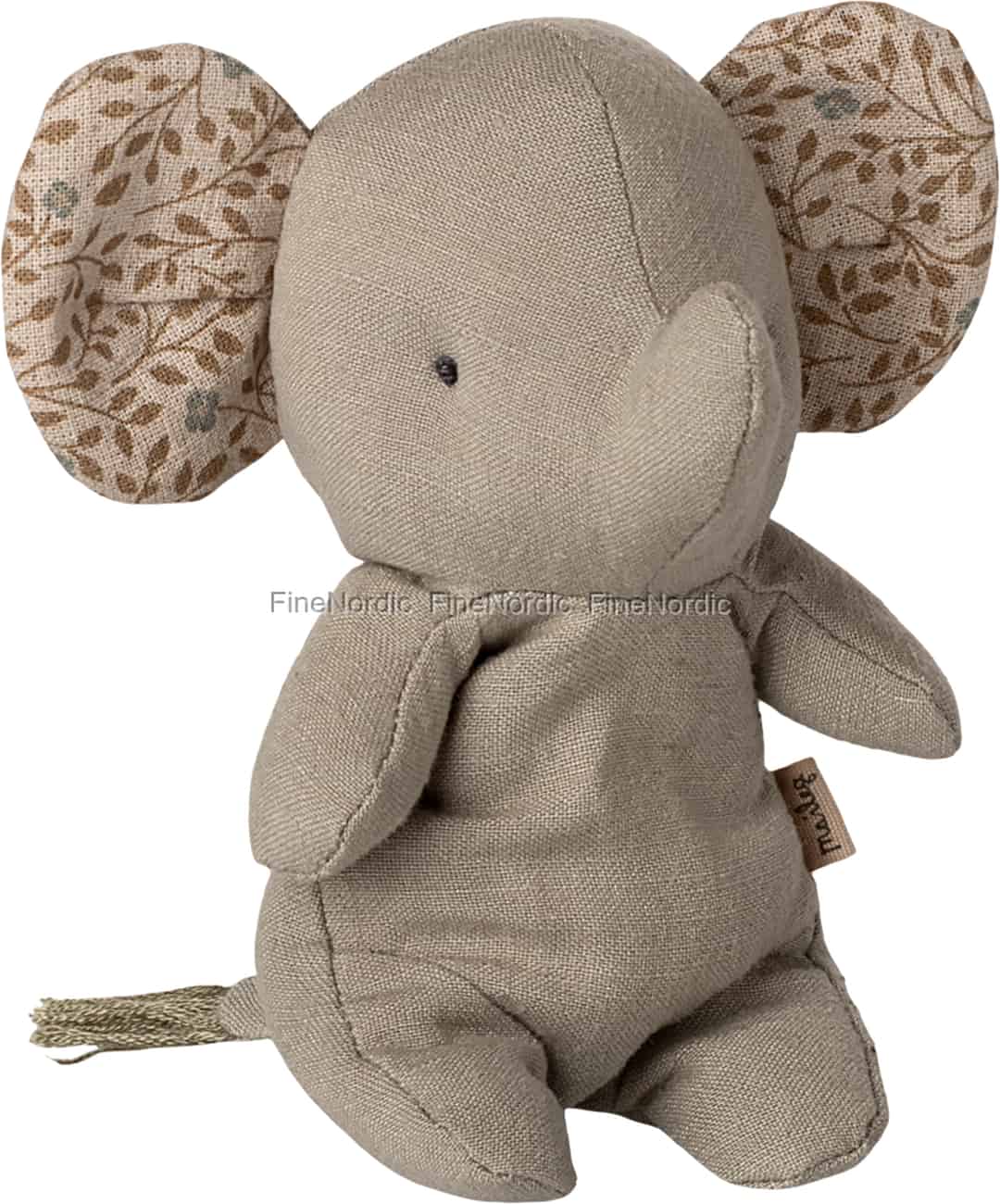 Välkomna en ny vän till ert hem med denna bedårande miniatyrelefant från Mailegs Safari Friends-kollektion. Hans milda själ fångas i de snälla, broderade ögonen och den mjuka, järngrå kroppen med linnelook. Han är en tystlåten följeslagare, skapad inte bara för lek, utan för att bli ett kärt minne i många år framöver. De stora öronen, fodrade med ett vackert botaniskt mönster, tycks lyssna uppmärksamt på varje viskad hemlighet och godnattsaga.