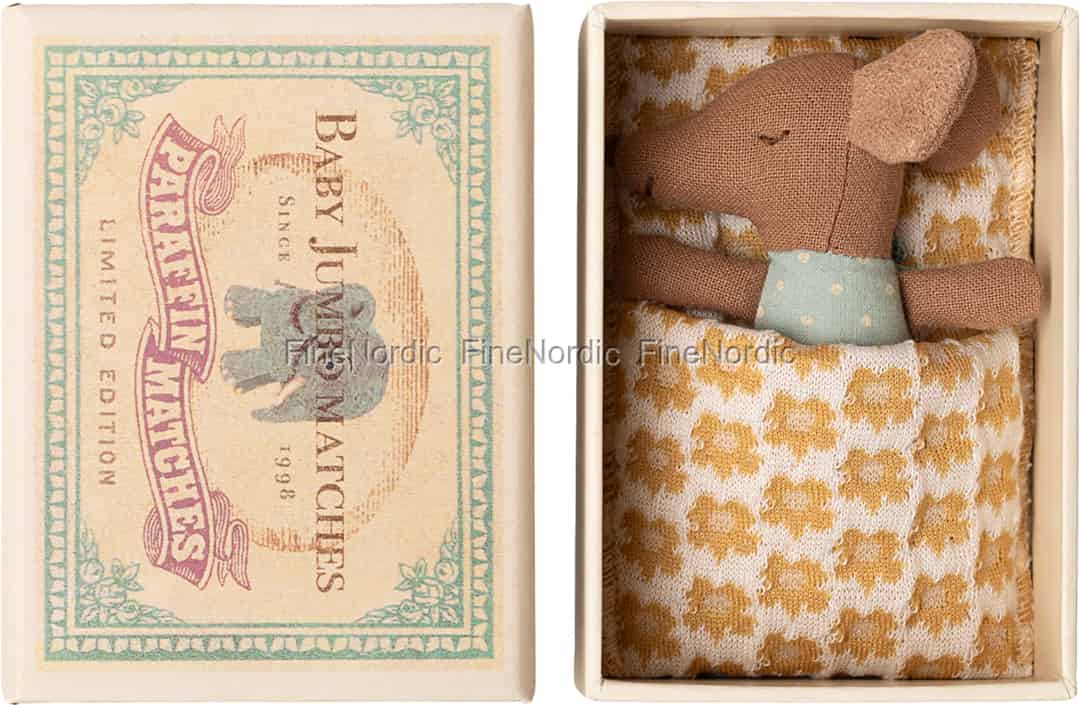 Öppna den charmiga tändsticksasken i vintagestil och upptäck en liten vän som väntar inuti. Denna söta babymus är redo för en dag fylld av stilla äventyr och en natt med ljuva drömmar i sin mysiga säng.
