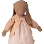 Varje detalj i denna miniatyrkofta är designad för att väcka förundran. Det mjuka, ljusrosa garnet är stickat till ett tidlöst plagg med fina, genombrutna detaljer runt halsringningen som vittnar om ett omsorgsfullt hantverk. De lätta puffärmarna skapar en finurlig silhuett, perfekt för Mailegs älskade kaniner i storlek 3. Det är mer än bara en accessoar; det är en liten skatt som ger en ny dimension av personlighet till en kär vän och gör den redo för en lugn eftermiddag fylld av fantasilekar.
