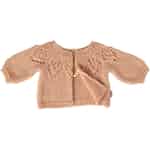 Varje detalj i denna Maileg-kofta är skapad för att väcka berättelser till liv. Den mjuka, ljusrosa stickningen känns underbart len och det intrikata hålmönstret över axlarna visar prov på det omsorgsfulla hantverk som Maileg är känt för. De charmiga puffärmarna och den klassiska ribbade kanten skapar en tidlös silhuett som förvandlar en enkel klädsel till något alldeles extra. Det är ett plagg som bjuder in till att sakta ner och uppskatta de små, vackra detaljerna som ger fantasivärldar liv.