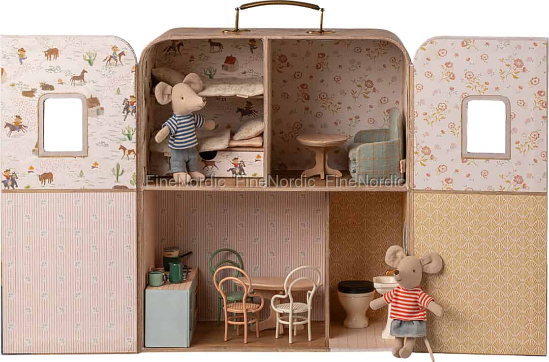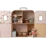 Föreställ dig ett litet hus som kan följa med överallt. Maileg SuitCasa ser ut som en charmig resväska på utsidan, men när du öppnar dörrarna avslöjas ett underbart hem med fyra rum, redo för dina minsta vänner att flytta in.