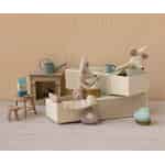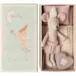 Denna lillasystermus är tillverkad av mjuka textilier med bedårande, handsydda detaljer och är ett bevis på Mailegs tidlösa design. Från hennes skimrande trollspö till den mjuka, stickade filten är varje detalj utformad för att inspirera till sagoberättande. Hon kommer redo för att sova i sin charmiga säng i tändsticksasken, en kär ägodel som kommer att bevara dyrbara minnen i många år framöver.