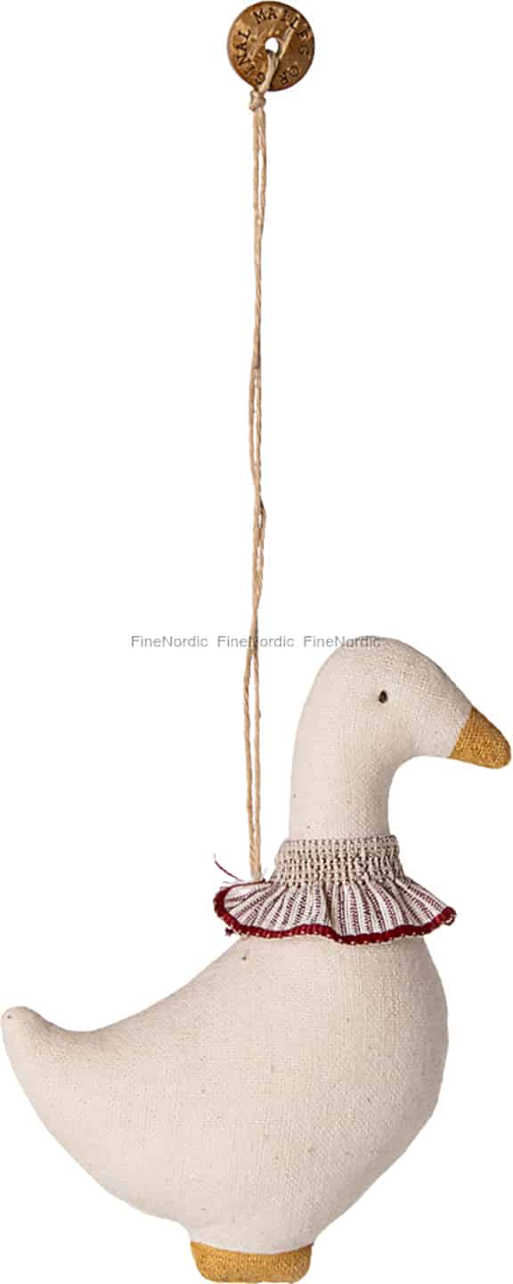 Välkomna en gnutta av Mailegs förtrollande värld till ditt hem med denna ljuvliga tygprydnad i form av en gås. Tillverkad med den omsorg och detaljrikedom som kännetecknar dansk design, är denna lilla karaktär redo att bli en del av dina mest älskade julberättelser. Den mjuka, texturerade bomullskroppen känns underbar att röra vid, medan dess lilla pärlöga och eleganta, röd-randiga krage ger den en helt egen personlighet. Det är mer än bara en dekoration; det är en liten vän som väntar på att locka fram ett leende.