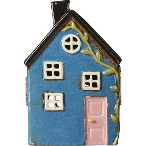 Ib Laursen Hus för värmeljus "Ebeltoft" ljusblå dörr - Stockrosor