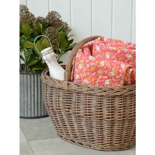 Rice Raffia Shoppingväska - Fabric Covered - Lädarhandtag - Light Blue Check - Stor