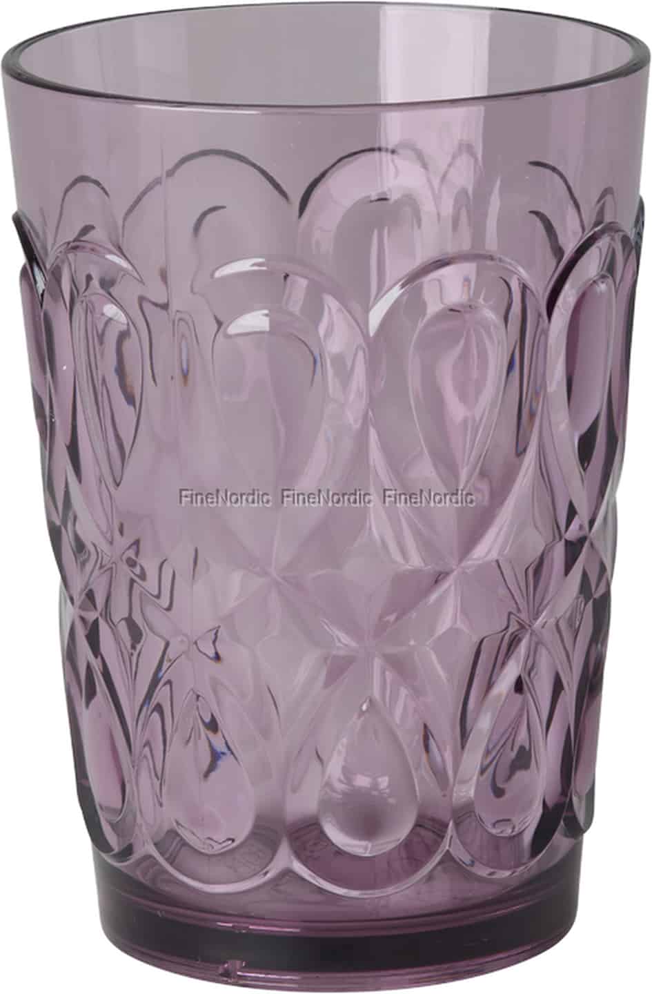 Från det danska varumärket Rice kommer detta glas som är en hyllning till färg och bekvämlighet. Dess vackra, mjukt plommonfärgade nyans tillför en mild värme till din dukning, medan det detaljerade reliefmönstret ger det en underbart taktil känsla och ett utseende som påminner om älskade antika glasföremål. Det är designat för dem som uppskattar skönhet i vardagen och förvandlar ett enkelt glas vatten eller juice till en förtjusande upplevelse.