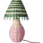 Från Rice kreativa värld kommer en lampa som verkligen förkroppsligar deras filosofi om 'vardagsmagi'. Varje exemplar är omsorgsfullt handvävt av naturlig raffia, vilket ger den en vackert texturerad och genuin känsla som massproducerade föremål helt enkelt inte kan efterlikna. Den päronformade foten blommar ut i ränder av mjukt rosa och crème, och leder upp till en klassisk konformad skärm där band av livfullt grönt tillför en uppfriskande, botanisk touch. Det är en design som känns både nostalgisk och underbart modern, ett bevis på glädjefylld dansk design.