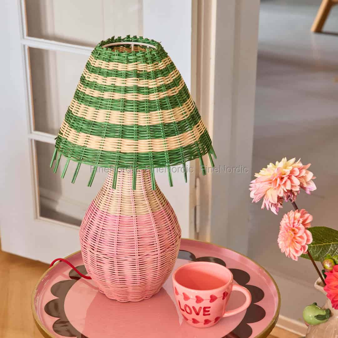 Föreställ dig ett mjukt, varmt ljus som silar genom ränder av glatt rosa och livfullt grönt. Denna vackra bordslampa från Rice är mer än bara en ljuskälla; den är ett handgjort stycke lycka, skapad för att locka fram ett leende.