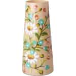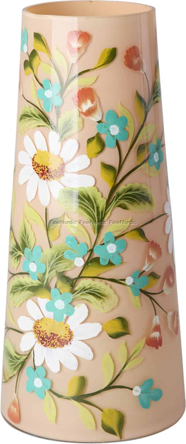 Låt den glädjefyllda känslan av en sommaräng blomstra i ditt hem året om. Denna utsökta glasvas från Rice är mer än bara en plats för blommor; den är en hyllning till färg och hantverk. Det varma persikofärgade glaset utgör en perfekt duk för de livfulla, handmålade blommorna som slingrar sig runt ytan. Du kan känna den härliga texturen från den upphöjda färgen under fingertopparna – de krispiga vita kronbladen på prästkragarna och de charmiga klasarna av små blå blommor, alla sammanlänkade av slingrande gröna stjälkar. Det är ett föremål som berättar en historia om glada dagar och konstnärlig passion.