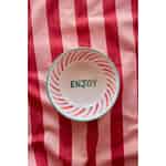 Från Rices kreativa värld kommer ett föremål som verkligen förkroppsligar deras filosofi om glädje, originalitet och funktionalitet. Denna stora keramikskål är som en målarduk för glada uttryck, från dess mjukt texturerade rosa utsida till de varma, strålande ränderna som pryder dess innerväggar. Varje penseldrag är ett bevis på hantverkarens hand, vilket skapar ett föremål som känns personligt och fullt av liv. I dess hjärta fungerar det enkla, handtextade ordet 'ENJOY' som en varsam knuff att stanna upp och uppskatta de goda tingen i livet.