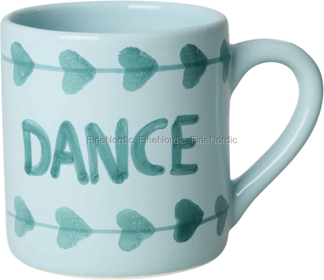 I morgonens stilla stunder kan kärlet du väljer för din första dryck sätta tonen för hela dagen. Denna underbara keramikmugg från Rice är designad för just det, och erbjuder mer än bara en plats för ditt te. Dess glada ljusblå nyans och det lekfullt handmålade ordet 'DANCE' fungerar som en mjuk, positiv knuff att hitta rytm och lycka i de små sakerna. De charmiga hjärt-pil-detaljerna tillför en gnutta nyckfull kärlek till designen, vilket gör varje klunk lite mer speciell.