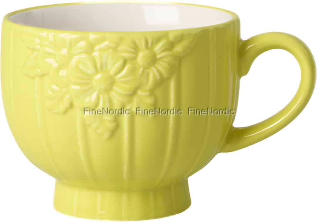 Det finns en särskild glädje i de enkla, vackra föremål vi använder varje dag, och denna keramikmugg från Rice fångar den känslan perfekt. Dess design är en hyllning till naturens charm, med fina blommor präglade över en mjukt räfflad yta som påminner om en solkysst sommaräng. Den glada gula glasyren är som solsken på flaska, skapad för att lyfta ditt humör och lysa upp din kökshylla. Varje detalj, från den eleganta foten till den kontrasterande krämfärgade insidan, har noga övervägts för att skapa en favorit du kommer att vilja använda om och om igen.