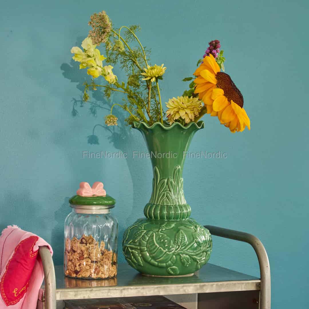 Låt den livfulla andan från en blommande trädgård flytta in på din spiselkrans eller ditt matsalsbord. Denna fantastiska vas från Rice är en sann hyllning till naturens konstnärskap, tillverkad av keramik med en djup, glansig grön finish som påminner om färgen på nya blad efter en vårregnskur. Varje kurva och detalj är designad för att förtjusa, från den bulliga basen omsluten av ett mönster av präglade bladverk till den eleganta halsen som drar blicken uppåt. Det är mer än bara en behållare för blommor; det är ett fristående konstverk som skänker en känsla av glädjefylld ymnighet till ditt hem.