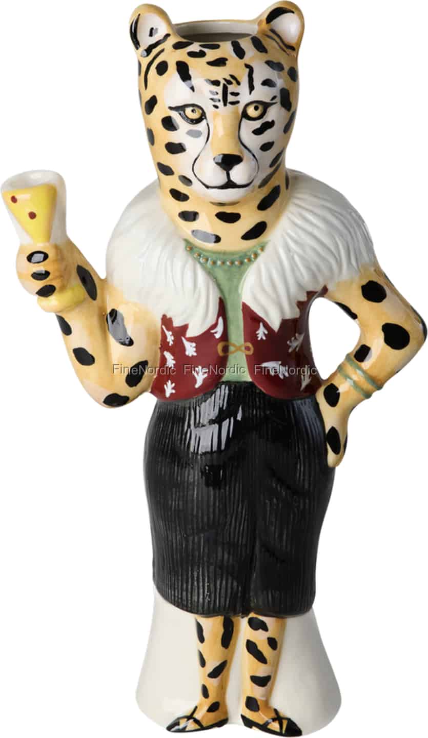 Stig in i en värld där konst och vardagsliv dansar tillsammans. Denna extraordinära leopardvas är ett bevis på det magiska samarbetet mellan det danska varumärket Rice och den hyllade parisiska konstnären Nathalie Lété. Känd för sin finurliga och berättande stil har Lété skapat en karaktär som är fylld av självförtroende och charm. Föreställ dig denna eleganta leopard, klädd för en kväll med skratt och historier, pryda din spiselkrans eller bokhylla. Hennes lekfulla uttryck fungerar som en daglig påminnelse om att omfamna glädjen i de vackra ögonblicken.
