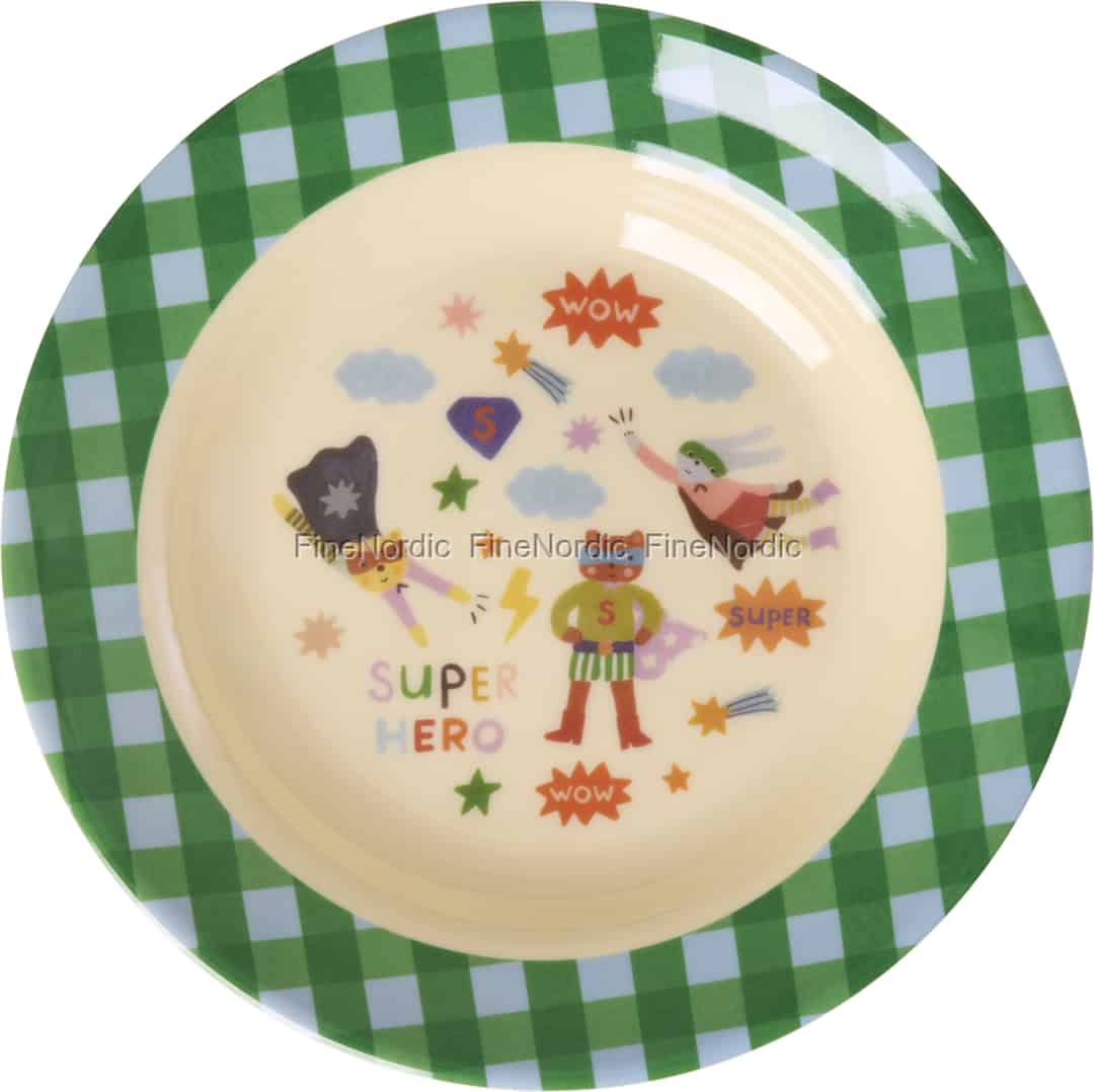 Föreställ dig leendena när din lilla skatt upptäcker sin nya favoritskål. Med sitt lekfulla superhjältetryck och glada, grönrutiga kant förvandlar denna charmiga skål från Rice vardagens frukostar och mellanmål till spännande äventyr.