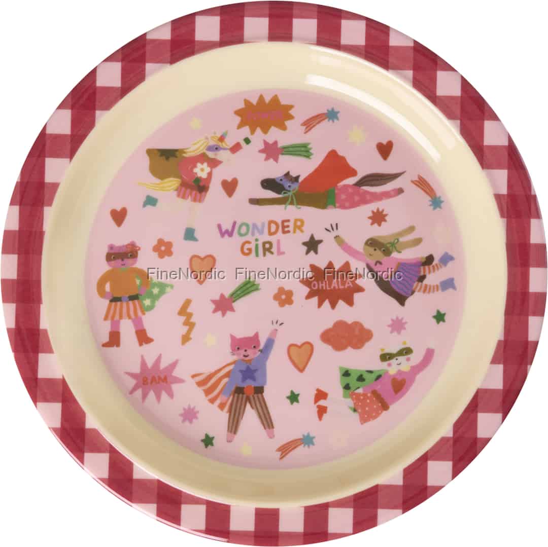 Från det välkända danska varumärket Rice är denna "Hero"-tallrik mer än bara ett köksredskap; den är en inbjudan till en värld av äventyr. Den glada, röd- och vitrutiga kanten ramar in en scen av ren förtjusning, där varje karaktär är redo för action. Föreställ dig hur din lilla skatt pekar ut sin favorithjälte och skapar berättelser om deras eskapader medan de njuter av sin lunch. 'Wonder Girl'-motivet hyllar styrkan och kreativiteten i varje barn, och gör även ett enkelt mellanmål till ett speciellt ögonblick.