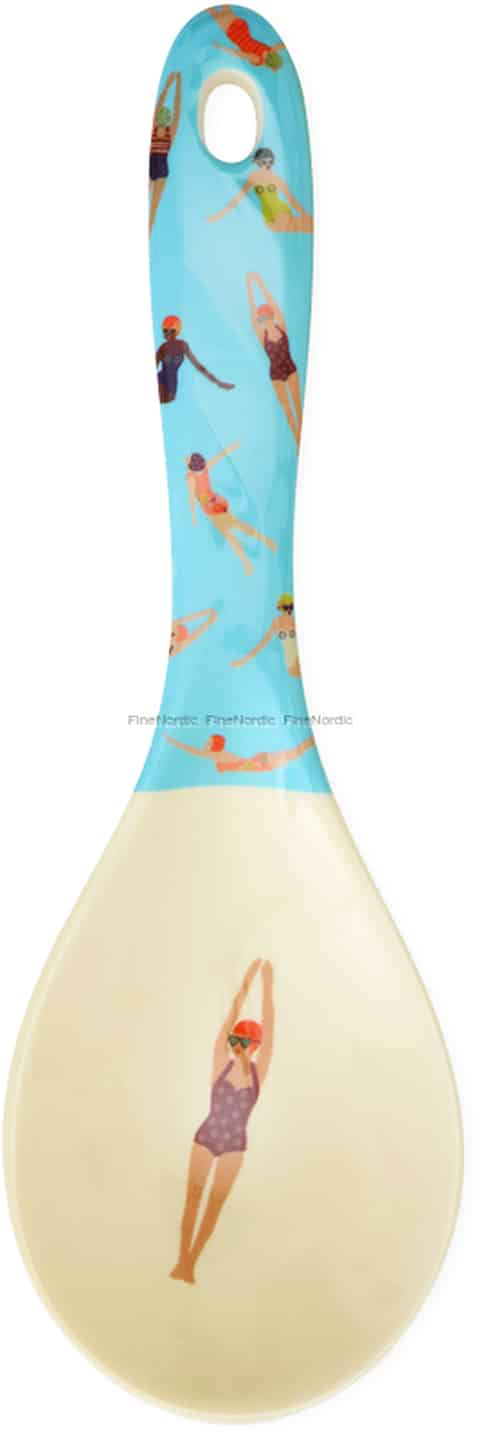 Minns du glädjen av en perfekt sommardag? Denna förtjusande salladssked från Rice fångar precis den känslan, med sina finurliga illustrationer av retrosimmare som glider genom svalt, turkost vatten. Den är skapad för att locka fram ett leende och addera en nypa lekfull nostalgi till ditt bord.