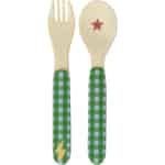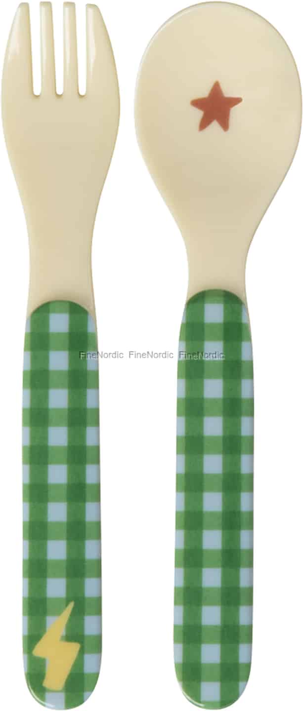Från det älskade danska varumärket Rice kommer detta 'Hero'-bestickset, designat för att strö lite magi över vardagens rutiner. Föreställ dig ditt barns glädje när de använder sin alldeles egna sked och gaffel, och förvandlar enkla måltider till spännande uppdrag. Det klassiska grönrutiga mönstret ger en tidlös charm, medan den energiska blixten och de söta stjärnmotiven inspirerar till berättelser om mod och skoj. Det är mer än bara bestick; det är en följeslagare på deras kulinariska resa.