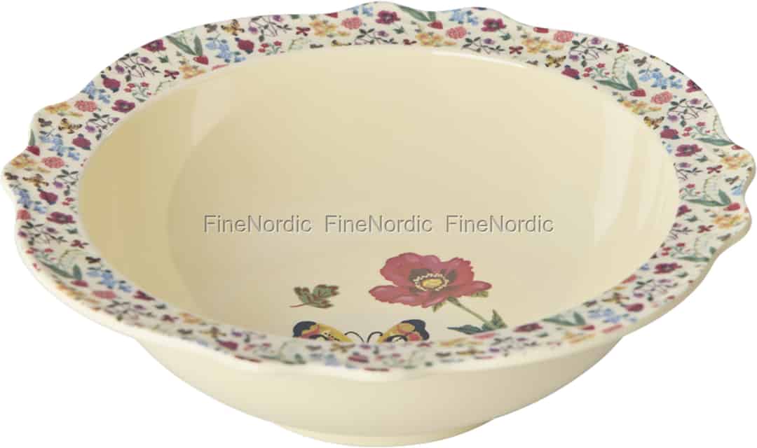 Låt varje måltid kännas som en promenad genom en solkysst fransk trädgård. Denna förtrollande skål är en del av ett speciellt samarbete mellan Rice och den hyllade konstnären Nathalie Lété, vars verk är kända för sin färgstarka och poetiska stil. Den gräddvita melaminen utgör en mjuk duk för berättelsen som utspelar sig inuti: en livfull vallmo och en skir fjäril som väntar på att upptäckas i botten av din tallrik. Den breda, vågiga kanten är ett mästerverk i sig, dekorerad med en tapet av små vildblommor som väcker minnen av picknickar på landet och varma eftermiddagar.