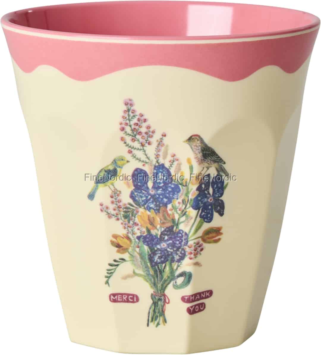 Upptäck en skapelse som är lika praktisk som den är poetisk. Denna medelstora mugg från Rice är en del av ett speciellt samarbete med den hyllade franska konstnären Nathalie Lété. Hennes signaturstil, fylld av fantasi, fångas vackert i den detaljerade illustrationen av en vildblomsbukett, komplett med två charmiga små fåglar. Orden 'Merci' och 'Thank You' är varsamt invävda i designen, vilket förvandlar varje klunk till ett litet ögonblick av tacksamhet. Den mjuka, krämfärgade utsidan utgör en perfekt duk för konsten, medan den kontrasterande korallrosa insidan tillför en glad färgklick som garanterat får dig att le.
