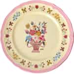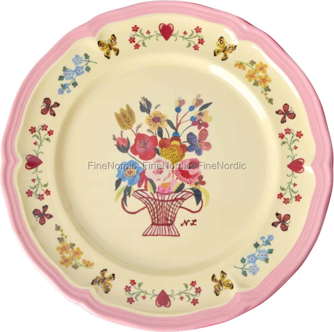 Låt ditt bord berätta en saga om finurlig förtjusning med denna vackra tallrik från Rice, skapad i samarbete med den hyllade franska konstnären Nathalie Lété. Hennes karaktäristiska folkkonststil väcks till liv i den centrala buketten som sprudlar av färg från sin charmiga korg. Varje detalj, från de fladdrande fjärilarna till de små hjärtana inbäddade bland blomsterkvistar, är designad för att framkalla känslan av en glad dag i en lantlig trädgård. Den mjuka, krämiga bakgrunden och den milda rosa, vågiga kanten skapar en perfekt målarduk för dessa förtrollande illustrationer.