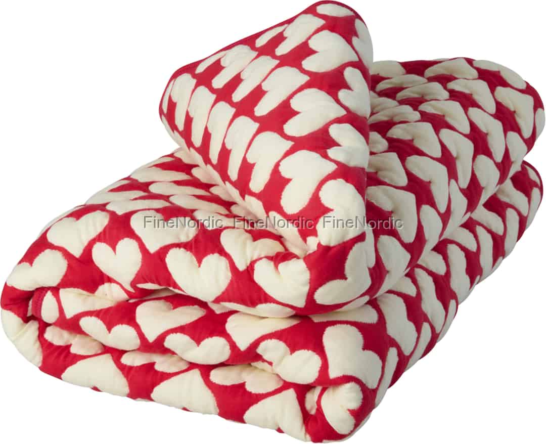 Introducera en känsla av lekfull värme i ditt hem med denna förtjusande quiltade filt från Rice. Dess livfulla röda och mjukt gräddvita hjärtmönster är en glad inbjudan att sakta ner, krypa upp och njuta av en stund av ren komfort.