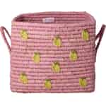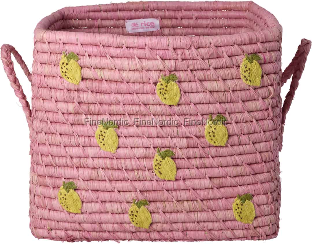 Upptäck hjärtat av dansk design med denna vackra korg från Rice, ett varumärke känt för att föra in färg och glädje i hemmet. Varje korg är kärleksfullt handgjord av raffia, en naturlig fiber från palmer, vilket ger den en underbart taktil kvalitet och en unik, rustik finish. Den livfulla rosa färgen skänker värme och energi, medan de söta broderade citronerna som är spridda över ytan tillför en glad och pigg personlighet som är helt oemotståndlig.