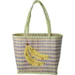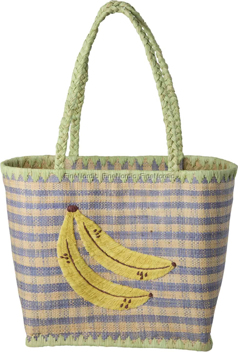 Från Rice kreativa värld kommer denna vackra raffiaväska, en hyllning till färg och karaktär. Varje väska är handgjord och bär på en berättelse om traditionellt hantverk förenat med modern dansk design. Den mjukt blå och naturfärgade ginghamväven skapar en klassisk bakgrund för de underbart lekfulla broderade bananerna – ett signum för Rice glädjefyllda estetik. De livfulla pistagegröna handtagen och kantbanden fulländar utseendet och gör varje blick till ett litet ögonblick av lycka.