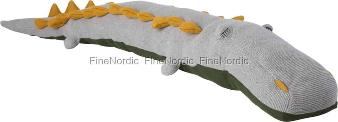 Föreställ dig en vänlig krokodil, inte från en vild flod, utan från hjärtat av en mysig skandinavisk sagobok. Denna underbara stickade vän från Rice är precis det – en mild väktare för ditt barns rum. Dess mjuka, ljunggrå bomullskropp är perfekt att luta sig mot under sagostunden, medan dess sömniga broderade ögon antyder att den alltid drömmer om nästa fridfulla äventyr. De glada senapsgula taggarna tillför en lekfull färgklick och gör den till ett karaktärsfullt tillskott i deras fantasivärld.