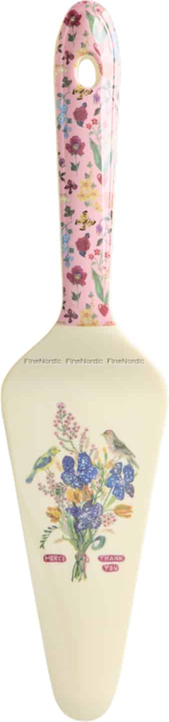 Upptäck den franska konstnären Nathalie Létés förtrollande värld med denna vackra tårtspade i melamin från Rice. Varje detalj är skapad för att förtjusa, från de charmiga fåglarna som vilar på en blombukett till de små, omtänksamma meddelandena 'Merci' och 'Thank You' på bladet. Den gräddfärgade basen utgör en perfekt duk för konstverket, medan handtaget sprudlar av ett kontrasterande rosa blommönster, vilket skapar ett föremål som är lika mycket ett konstverk som ett funktionellt köksredskap. Den känns lätt men ändå robust i handen, redo att servera dina favoritbakverk.