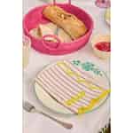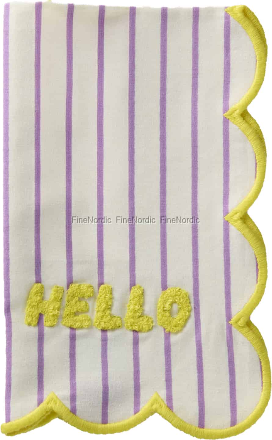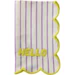 Från Rice kreativa värld kommer en servett som är mer än bara en bordsdukning – den är en inbjudan till ett leende. Föreställ dig att veckla ut denna mjuka bomullskvadrat och mötas av dess soliga 'HELLO'. Kombinationen av milda lavendelränder och den glada, vågiga gula kanten är ren lycka, designad för att lysa upp dina måltider och väcka samtal. Det är en liten detalj som säger mycket om din kärlek till ett hem fyllt med värme och personlighet, och som förvandlar även den enklaste måltiden till ett förtjusande ögonblick.