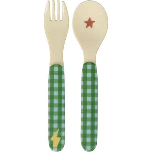 Rice Melamin sked och gaffel för barn "Hero" - Grön