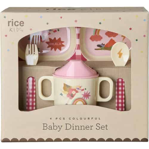 Rice Melamin middagsservis för baby i presentförpackning "Hero" Rosa - Set med 4 delar